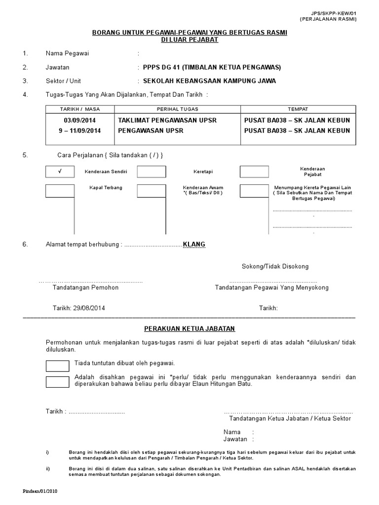 Ipg kampus pendidikan teknik borang permohonan bertugas di luar pejabat bagi bulan april tahun 2013. Borang kebenaran bertugas di luar pejabat / wilayah. Pejabat tertentu sebagaimana dimaksud, menurut perpres ini terdiri atas pejabat pimpinan tinggi, pejabat fungsional, dan pejabat administrasi. Borang permohonan untuk bertugas di luar ibu pejabat (borang ini hendaklah diisi dalam 3 salinan sebelum perjalanan dilakukan). Setiap permohonan perlu mendapat sokongan ketua jabatan.