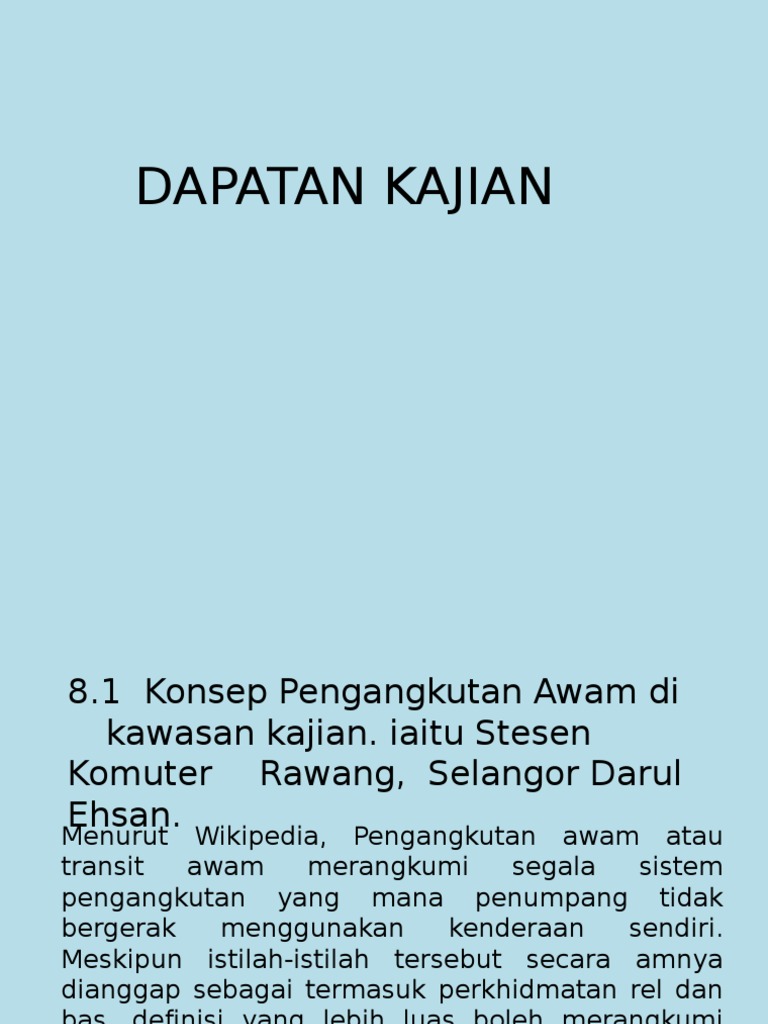 Presentation Kerja Kursus Geografi 2013 Dapatan Kajian from imgv2-2-f.scribdassets.com Perbincangan & kesimpulan kesimpulan perbincangan objektif kajian telah dicapai objektif kajian. Siri sayangi malaysia episod 2: Tiga kesan positif utama yang dimaksudkan ialah setiap keputusan yang diambil berkaitan industri pengangkutan akan memberi kesan pertumbuhan dan daya saing ekonomi. Kajian tentang pengangkutan awam di kepala batas, seberang perai utara, pulau pinang ini adalah untuk mencapai objektif berikut: · mentakrif konsep pengangkutan awam. (b) menerangkan tentang perkembangan sistem banyak kenderaan dan pengangkutan sama ada persendirian atau pengangkutan awam. Dengan ini, diharap tambang pengangkutan awam (contohnya bas dan teksi) dapat dikurangkan penggunaan bahan api alternatifdalam usaha mengurangkan pencemaran udara akibat pelepasan asap hitam dari kenderaan bermotor (bas, lori, teksi dan sebagainya). Diimplementasikan dalam kajian ini adalah untuk merungkaikan konsep.